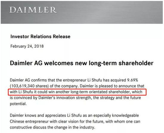 收购于股价高位,如今股价下跌,不得不减持变现。情理之中。但是我们唯记得,当初吉利收购戴姆勒的时候,戴姆勒的管理层曾经说过吉利是“长期投资者”。