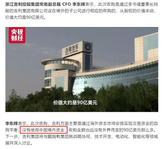 图中可见,吉利的首席财政官(CFO)李东辉一再强调此次收购动用的资金“是很小的一部分”,而且言语之中还似有得以之色。而吉利官方披露中,对收购资金的描述是,未使用国内资金。