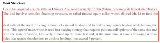 “这样可以不需要一大笔外部资金便可建立较大的股票持仓,同时这样的工具所采用的是期权,使得吉利可以建立股票持仓,同时避免德国监管要求的‘持股超过3%便要举牌’的规则。”