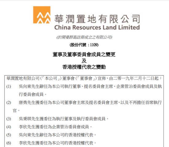 同日,沈彤东先生获委任为华润置地执行董事以及执行委员会成员。唐勇先生不再担任本董事会副主席及获委任为本公司首席执行官。李欣先生获委任为公司总裁。张大为先生获委任为公司董事会副主席。