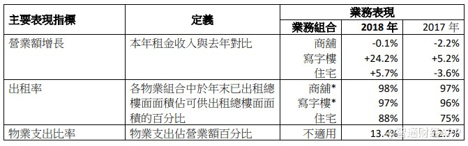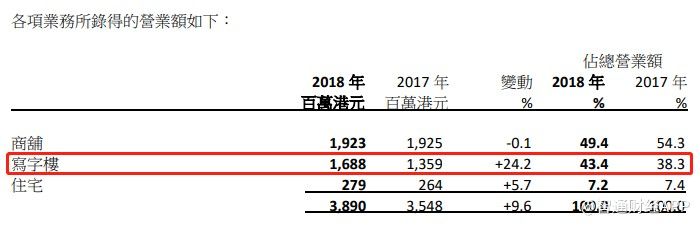 财报显示,写字楼租金收入同比增长24.2%,增速同比大幅提升,对整体收入贡献达到43.4%,较2017年增加5.1个百分点,主要由于新落成的利园三期以写字楼为主,加上物业组合内其他办公大楼的新订租金上升。