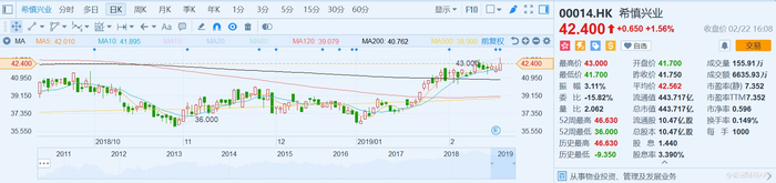 业绩公布次日(2月22日),希慎兴业股价低开高走,盘中最高涨约3%,但盘尾涨幅收窄,当日收涨1.56%,报42.4港元,成交额6635.93万港元。