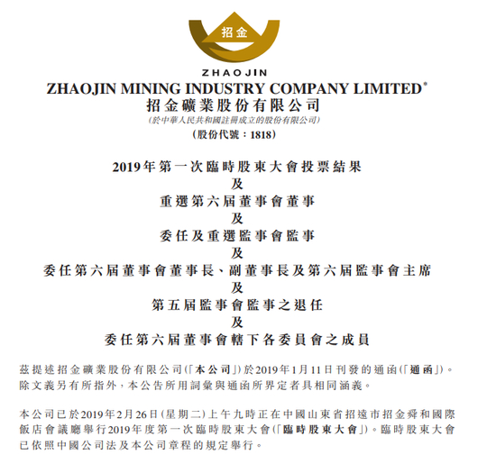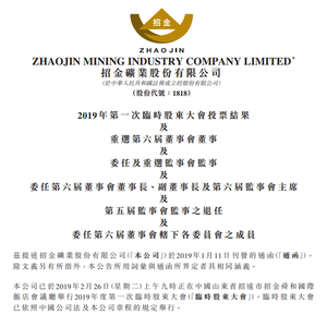 新浪港股讯 招金矿业发布公告,于2月26日临时股东大会,该公司第五届董事会之董事翁占斌先生、董鑫先生、王立刚先生、 徐晓亮先生、刘永胜先生、姚子平先生、高敏先生、陈晋蓉女士、蔡思聪先生、魏俊浩先生及申士富先生获重选为第六届董事会董事。