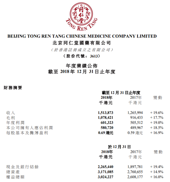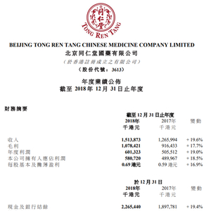 新浪港股讯 同仁堂国药发布2018年度业绩,截至2018年12月31日止年度,实现收入15.14亿港元,同比增长19.6%;毛利10.78亿港元,同比增长17.7%,毛利率由上年同期的72.4%降至71.2%;公司拥有人应占利润5.81亿港元,同比增长18.5%;每股基本盈利为0.69港元,拟派末期股息每股0.23港元。