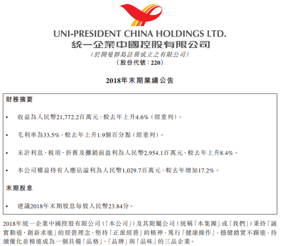 统一企业中国:2018年纯利升17.2%至10.3亿
