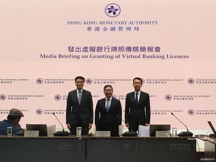 3月27日,香港金管局召开新闻发布会,公布虚拟银行发牌结果,香港金管局助理总裁(银行操守)区毓麟(下左)、副总裁阮国恒(下中)及助理总裁(银行监理)陈景宏(下右)出席了本次会议。
