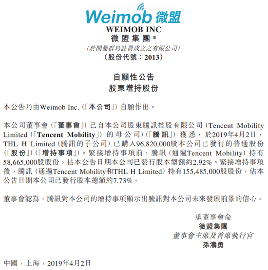 新浪港股讯 微盟集团发布公告,公司董事会已自公司股东腾讯控股有限公司(Tencent Mobility Limited的母公司)获悉,于2019年4月2日,THL H Limited(腾讯的子公司)已购入9682万股公司已发行的普通股份。