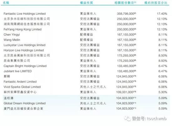 映客联合创始人侯广凌(通过其妻子wang meilin)、廖洁鸣(通过其丈夫chenyingyi)分别持股为8.11%;映客首席战略官姜谷鹏持股6.47%。