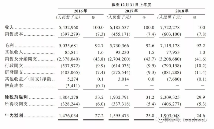 翰森制药于2016年、2017年及2018年的毛利率分别为92.7%、92.6%及92.2%,而纯利率分别为27.2%、25.8%及24.6%。