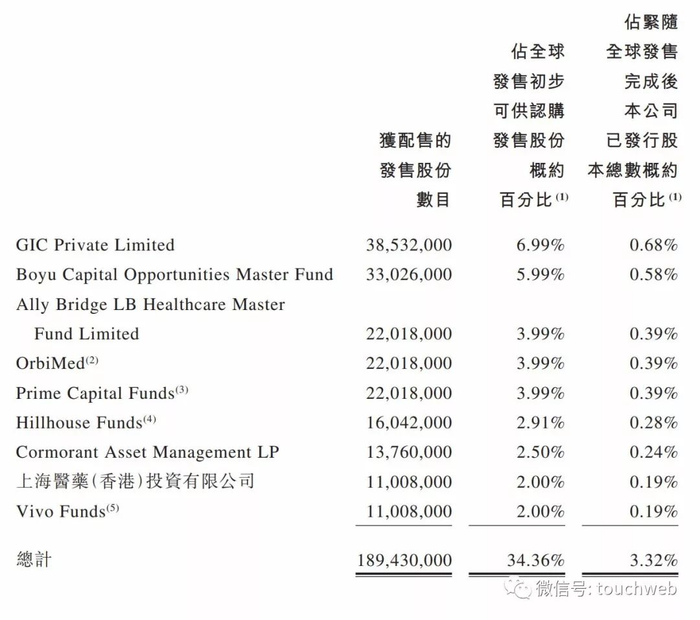 翰森制药的基石投资者包括GIC、Boyu、Ally Bridge LB Healthcare Master Fund Limited、OrbiMed、Prime Capital Funds、上海医药、高瓴资本、Vivo Funds等。