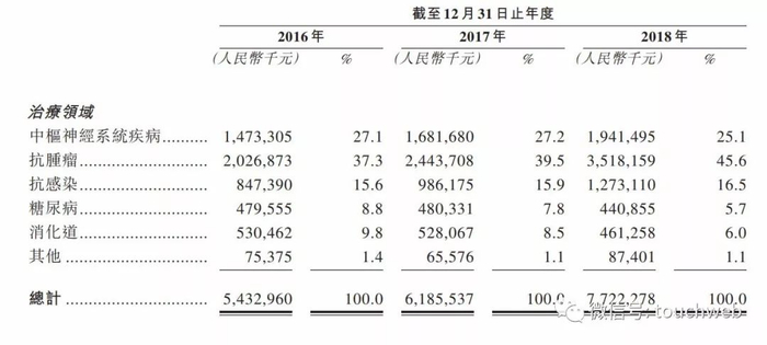2016年、2017年及2018年,翰森制药的中枢神经系统疾病药物收入分别为14.73亿、16.817亿及19.415亿,占比分别为27.1%、27.2%和25.1%。