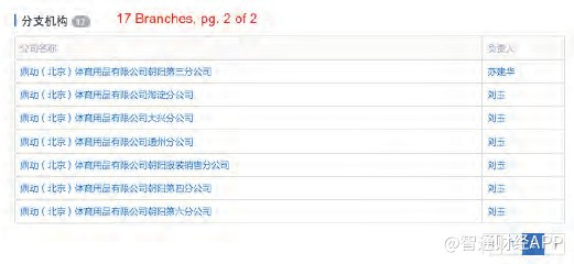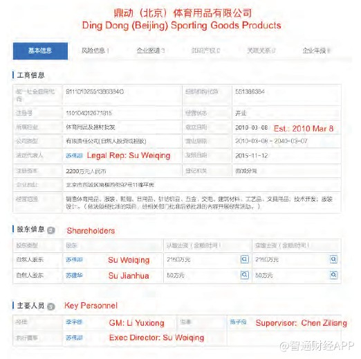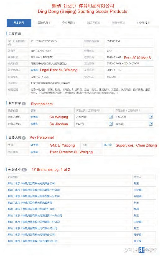在第一份报告中,我们还展示了关于李宇雄于2011年至2017年担任安踏分销商——北京吉元盛宝的总经理一职以及是老板丁世忠的代理的证据。我们发现李先生又一次卷入其中,这次的对象是鼎动(北京)。