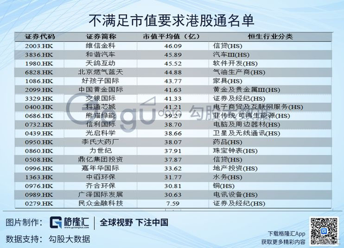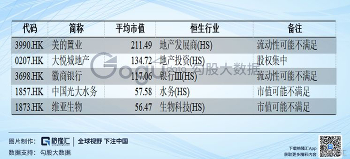 勾股大数据也计算了因不满足市值标准(这期HSCI剔除标准35亿,但港股通剔除标准为50亿)而可能从港股通剔除的股票。