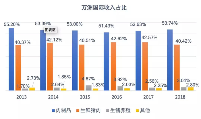 平淡财务数据的背后是万洲的生猪出栏量、屠宰量和肉制品的销售量在过去五年也基本没变化。按产品拆分来看,肉制品、生鲜猪肉和生猪养殖收入占比分别为53.7%,40.4%和3%,经营利润占比分别为93.7%,14.9%和-6.85%,业绩主要靠肉制品业务在撑。