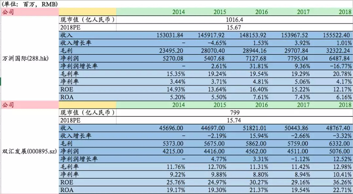 从2014年到2018年的财务数据来看,双汇发展的收入基本维持在450亿到500亿人民币的区间,净利润维持在40-50亿人民币,母公司万洲国际收入维持在220亿美元,净利润受美国业务影响波动比较大,在7.6亿-11亿美元之间,过去五年表现非常平淡,基本没啥增长。