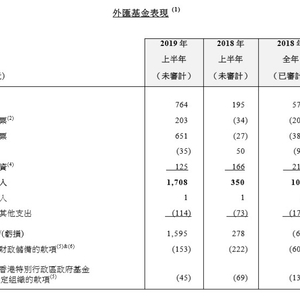 2019年外汇基金支付给财政储备存款与香港特别行政区政府基金及法定组织存款的息率为2.9%,上半年相关费用分别为153亿港元及45亿港元。在扣除所有支出及应计费用后,外汇基金累计盈余增加1219亿港元。