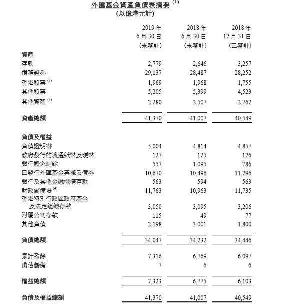 2019年6月底外汇基金的总资产为41370亿港元,较2018年底增加821亿港元。