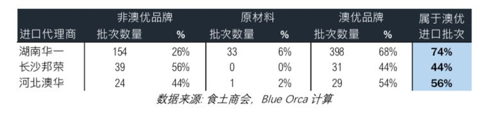 但是湖南华一是最重要的进口代理商。根据食土商会记录, 澳优 86%的配方奶粉进口都是通过进口代理商湖南华一。