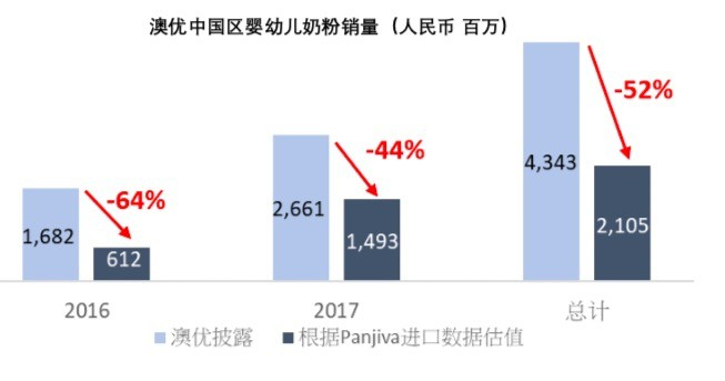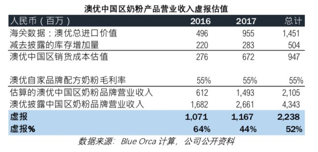 1. 海关数据显示婴幼儿配方奶粉在中国区的销售额虚报 52%。 澳优声称其在中国销售的所有婴幼儿配方奶粉产品都是从澳优位于欧洲,新西兰和澳大利亚的自有工厂或者第三方供应商处进口的。然而公开的海关数据显示,澳优进口的婴幼儿配方奶粉数量远低于澳优声称的数量。我们认为这表明澳优夸大了营业收入和利润。在 2016和 2017 年这两年期间,根据澳优的进口代理商披露的进口额,我们计算出澳优虚报了 52%的中国区配方奶粉销售额。