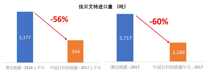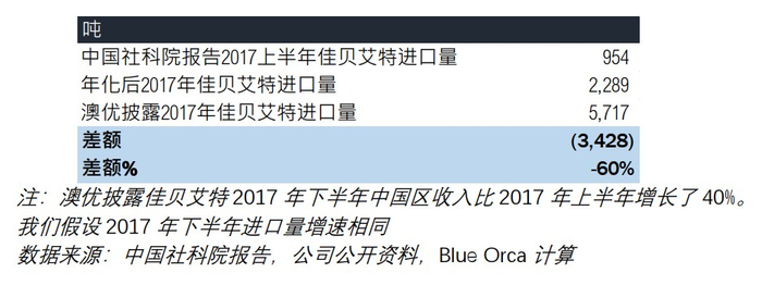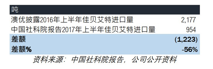 中国社科院的报告显示佳贝艾特在 2017 年上半年进口的羊奶粉数量比 2016 年上半年披露的进口量少 56%。澳优披露的与实际的进口量之间的差距与澳优声称的佳贝艾特在中国的销量增长大相径庭。我们认为中国社科院的数据明确无误地表明澳优极大地夸大了其旗舰婴幼儿配方羊奶粉的进口数量(以及销售额)。