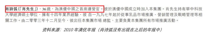 从 2003 年 12 月到至少 2011 年,肖诗弧一直是澳优企业丑闻的核心——澳优中国的高级管理层(首席运营官和市场总监)。