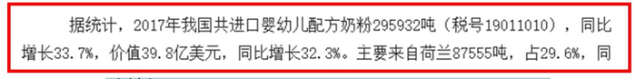 我们确认 Panjiva 的数据是全面完整的。中国海关报告称, 2017 年中国进口了价值美元 39.8 亿的婴幼儿配方奶粉(HS 编号 19011010)。