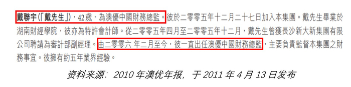 公司停牌前发布的最后一份年报,即 2011 年 4 月提交的 2010 年年报中,澳优称戴联宇是澳优中国的财务总监。澳优称戴联宇从 2006 年 2 月份开始就身居此位。
