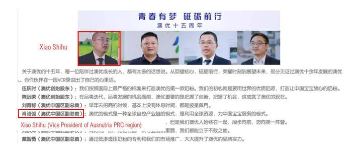 作为被发现伪造销售额的企业的首席运营官,我们认为他应该在这场丑闻后被解雇。然而,肖诗弧不仅拥有一家未披露的关联方分销商 42%的股份,而且他看起来仍是澳优的一名高管。在澳优网站上的一篇文章中,肖诗弧被称为澳优中国区的副总裁。