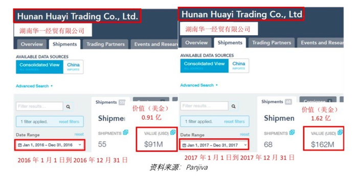 Panjiva 进出口数据的可靠性得到了湖南华一官方网站的证实。湖南华一称其在 2016 年仅进口了价值美元0.83 亿的婴幼儿配方奶粉,并预计在 2017 年将进口超过美元 1 亿的婴幼儿配方奶粉。