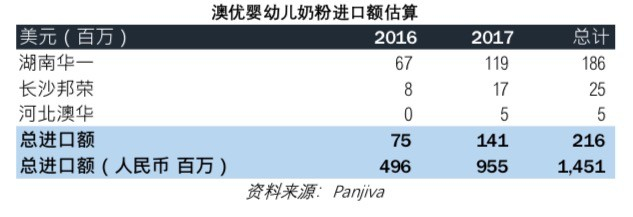 根据 Panjiva 汇总并提供的进口记录,近乎独家代理澳优的进口代理商湖南华一,在 2016 年和 2017 年分别只进口了价值美元 0.91 亿和美元 1.62 亿的婴幼儿配方奶粉产品。