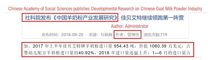 然而,政府直属的中国社会科学院(“中国社科院“) 发布的一篇关于中国羊奶粉产业研究报告1与澳优披露的进口数据相矛盾。 中国社科院报告的可靠性是毋庸置疑的。 这篇报告不仅被中国共产党的官方报纸人民日报引用, 连佳贝艾特自己的新闻稿也引用了该报告。