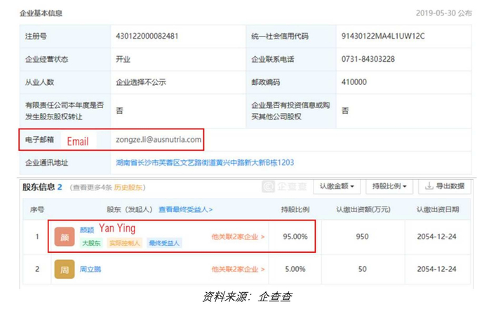 b. 澳联和美:另一家未披露的关联分销商。 在最近的公告中,澳优将代膳品牌产品的主要分销商之一,湖南澳联和美食品有限公司(“澳联和美”),称为独立第三方。然而,证据显示澳联和美实际上又是一个未披露的关联方分销商。一位澳优高管持有澳联和美 95%的股份,澳联和美登记在案的邮箱使用@ausnutria.com 后缀,并且在多家网站上声称自己是澳优的子公司。此类交易创造了巨大的风险: 澳优可以(再一次地)利用这些受控制的分销商伪造收入,或者高管们(再一次地)以牺牲股东利益为代价,秘密敛财。