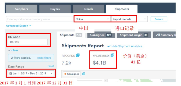 根据 HS 编号 1901107搜索, Panjiva 的中国进口记录显示了与中国海关报告相似的进口额8。