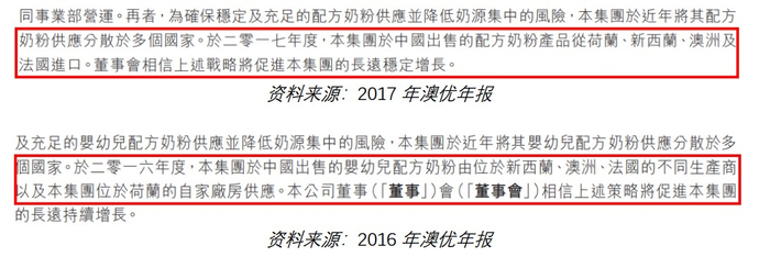 澳优声称所有在中国出售的婴幼儿配方奶粉都是从位于荷兰,法国,新西兰和澳大利亚的自有工厂或者第三方供应商处进口的。 的确, 澳优营销的关键卖点之一就是公司的绝大多数产品都是在海外生产,包装和贴牌2。