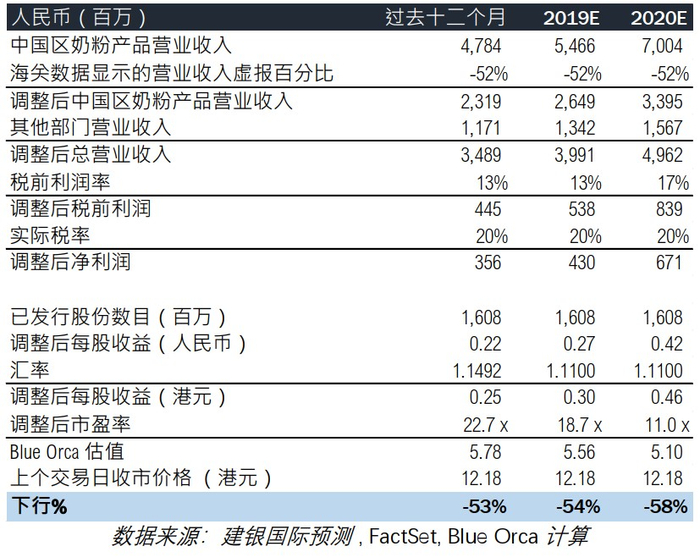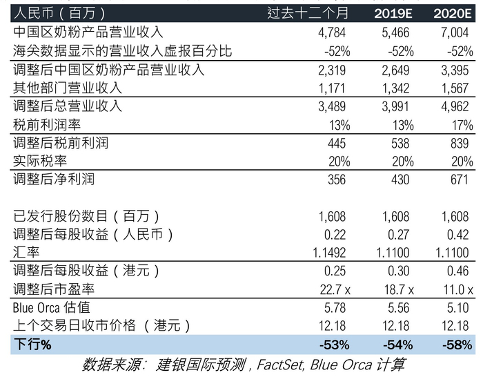 我们认为,根据本报告展示的证据,澳优虚报了营业收入并且低报了费用。 中国海关数据显示澳优进口奶粉的金额和数量远远低于达到公司披露的销售额所需要的数量。在 2016 和 2017 年两年间,我们根据澳优的进口代理商所披露的进口额计算出,澳优虚报了 52%其在中国的婴幼儿配方奶粉收入。 根据这些独立的证据, 我们认为将披露的和预测的澳优中国区婴儿奶粉收入向下调整 52%再对公司进行估值是合理的。