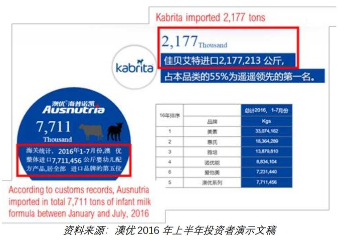 在 2016 年中期投资者演示文稿中,澳优声称其在 2016 年上半年进口了 2,177 吨佳贝艾特品牌婴幼儿羊奶粉到中国,占了同期中国进口婴幼儿羊奶粉总量的 55%。
