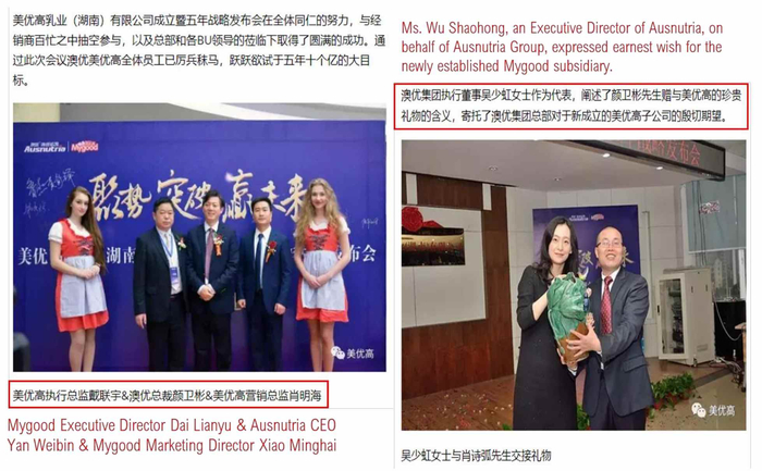 根据一篇新闻报道,在 2017 年 1 月美优高湖南的开业典礼上,澳优主席颜卫彬和澳优执行董事吴少虹出席了活动。吴少虹称美优高湖南为澳优的子公司。美优高湖南宣布了一个野心勃勃的计划,要在五年内实现人民币 10 亿的销售目标。