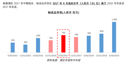 如果澳优确实在 2017 年中期经历了产品短缺,那么其中期报告应该显示更低的制成品存货水平。然而,事 实却截然相反。澳优制成品存货(产品)位于近年的最高点。