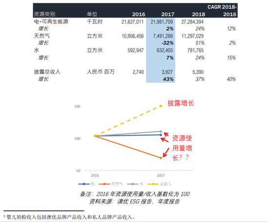 澳优披露的包装材料使用量和海关数据及进口记录相符。我们认为这表明澳优生产和销售的婴幼儿配方奶 粉罐数远低于其向投资者披露水平。 如果比较公司披露的收入增长和 ESG 报告中披露的资源使用量,我们发现了同样的问题。尽管收入在 2017 年增长了 43%,该年澳优的电和水的使用量基本持平,而天然气使用量下降了 32%。