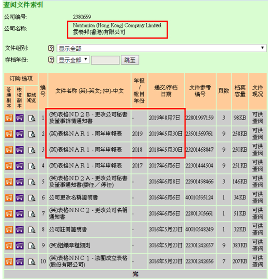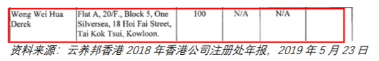 根据香港公司注册处,云养邦香港之后并没有股权变动。2019 年 8 月 7 日有一份更改公司秘书和董事详情 通知书,而在该文件里,公司首席财务官王炜华 (Wong Wei Hua Derek)依然是唯一董事。