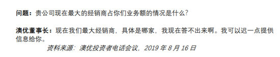 这只有两种可能。一种是澳优董事长并不知道澳优最大的分销商的身份(我们认为非常不可能),或他实 际上在拒绝回答这个问题,因为他不希望任何人审查澳优和这家分销商的关系。在我们的报告中,我们揭 露了数个未披露关联方分销商由澳优高管全部或部分持有。然而由于澳优极少披露其最大客户的身份,我 们的调查受到了限制。我们的推断是,澳优拒绝回答这个简单问题是因为答案会对澳优极其不利。 电话会议里的声音并不清晰。在澳优董事长含糊其辞后,另一位澳优高管表明佳贝艾特最大的分销商是“四 川创多”(音译)。