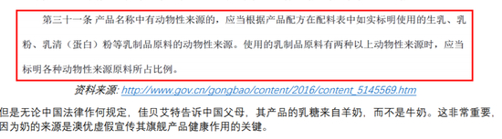 最值得注意的是,澳优在澄清公告中承认,佳贝艾特婴幼儿配方羊奶粉的乳糖实际上来自牛奶。如果我们 是中国父母,我们将对此感到非常愤怒。在澄清公告中,澳优试图通过中国法律来解释。澳优表明中国法 律“无规定奶粉产品须指明乳糖之动物性来源”。我们反对这个说法。我们对相关的中国国家食品药品监督管 理总局的管理办法的解读是,第三十一条规定明确要求佳贝艾特披露其羊奶粉含有牛乳糖。