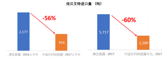 在投资者电话会议上,澳优尝试解释我们最确凿的一些证据。我们展现了政府直属机构的研究报告(“社科 院报告“),表明 2017 年上半年,澳优只进口了 954 吨佳贝艾特牌羊奶粉。这比澳优一年前所称进口量 (2016 年上半年)少 56%,而且如果我们年化这个数据,这比澳优披露 2017 年全年进口佳贝艾特(数量) 少了 60%。