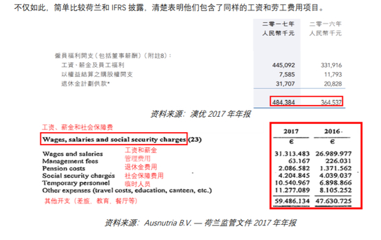 在我们报告中,我们展示了澳优子公司 Ausnutria, B.V. 和其子公司的荷兰监管文件。这些公司占了澳优全职 员工的 40%,但根据荷兰监管文件, Ausnutria, B.V. 和其子公司披露的工资、薪金和退休金占了全公司 2017 年披露的合并人工费用的 94%。 除非澳优剩余 60%的员工无偿工作,否则澳优就在香港报表中低报了人工费 用。我们认为显然是后者。
