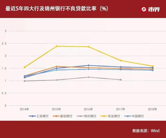以2017年为例,四大行中不良率最低的是中国银行,为1.45%,比锦州银行高0.41个百分点。商业银行信贷资产规模动辄数千亿元,0.41%可能就是数十亿元的不良贷款,影响巨大。