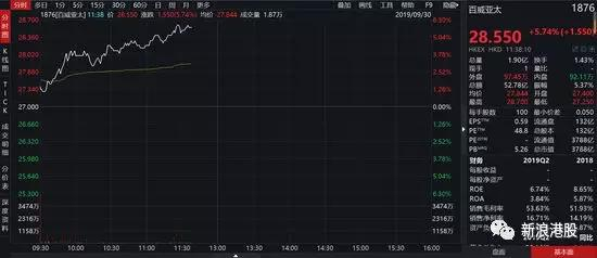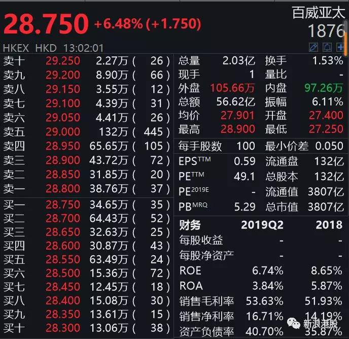 新浪港股讯 9月30日消息,港股又迎来一只巨无霸,曾经在7月上市搁浅的百威亚太(01876.HK)卷土重赖,今日挂牌上市股价高开高走,午盘暴涨近7%,股价高见28.85港元,市值日前突破3800亿港元,折合486亿美元。