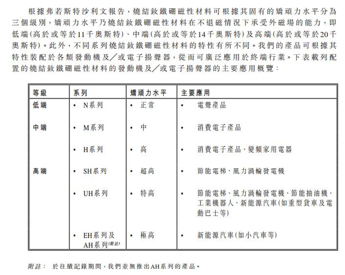 星宇所生产的永磁产品用途广泛,根据永磁产品等级的差异, 主要用于下游汽车,风电,家电/消费电子的电机产品上(图4:钕铁硼磁材级别图)。