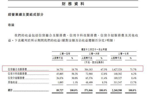 招股书披露,51信用卡2015年、2016年、2017年的收益总额依次约为8973万元、5.71亿元、22.69亿元,复合年增长率高达402.9%.就营收而言,2017年与2015年相比增加24.2倍。其大部分收益来源于51信用卡的第三项主营业务——线上信贷撮合及投资服务。