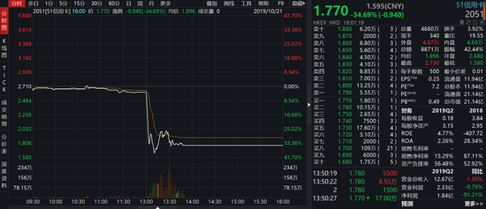 公司新闻震惊了市场,公司股价午后闪崩,一度暴跌40%。随后,51信用卡宣布,公司的股份已于10月21日下午1时50分起短暂停止买卖,停牌前跌幅收窄至34.69%,最新市值21亿港元,11亿市值蒸发。