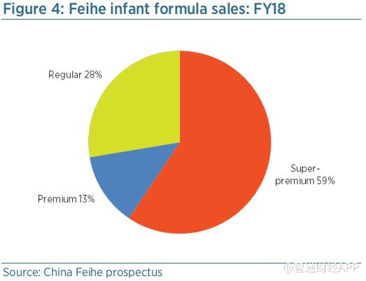 因此,仅几年时间,飞鹤的业务就从专注于价格较低的普通婴幼儿配方奶粉,转变为超高端产品。2018财年中,超高端占飞鹤婴幼儿配方奶粉销售额的59%(几乎全部为星飞帆),而普通婴幼儿配方奶粉仅占28%,高端婴幼儿配方奶粉仅占13%(图4)。相比之下,四年前,普通婴幼儿配方奶粉仍占销售额的68%,而超高端婴幼儿配方奶粉仅占10%(图5)。